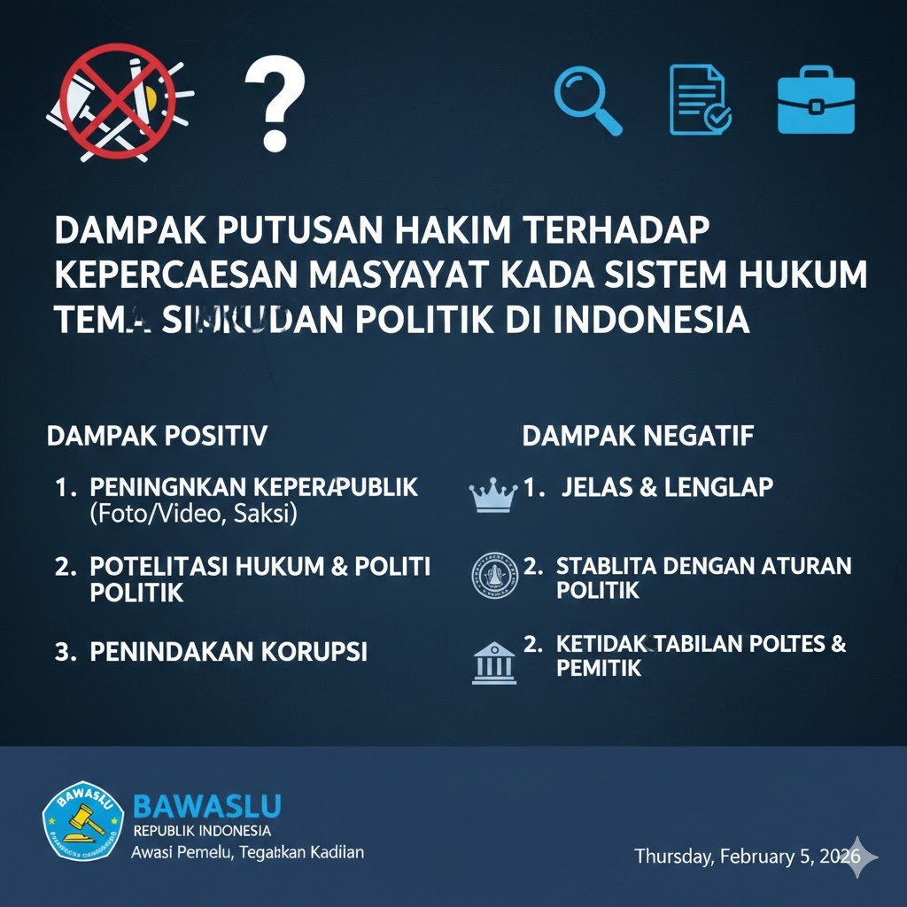 Kesimpulannya, putusan hakim adalah cermin dari kualitas peradaban hukum sebuah bangsa. Dampak dari setiap putusan tersebut sangat mendalam terhadap psikologi sosial dan stabilitas politik nasional. Jika hakim mampu menjaga independensi dan memutus perkara dengan hati nurani serta dasar hukum yang presisi, maka kepercayaan masyarakat akan menguat, yang pada gilirannya akan memperkokoh sendi-sendi demokrasi di Indonesia. Sebaliknya, pengabaian terhadap rasa keadilan masyarakat hanya akan menjauhkan rakyat dari hukumnya sendiri, menciptakan ketidakpastian yang membahayakan masa depan bangsa. Reformasi hukum tidak boleh hanya berhenti pada perubahan regulasi, tetapi harus menyentuh pada penguatan moralitas para pemegang palu keadilan.
